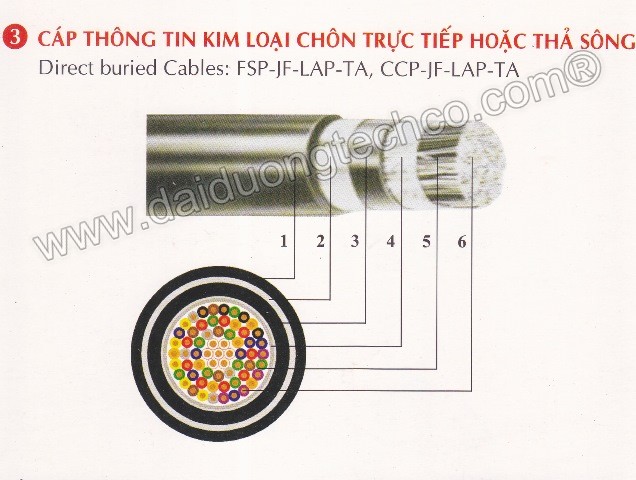 Cáp thông tin kim loại chôn trực tiếp có dầu (CCP-JF-LAP-TA: 100x2x0,65xnP) được sản xuất theo tiêu chuẩn ngành TCN 68-132: 1998. Cấp dùng để truyền tín hiệu, được lắp đặt chôn ngầm trong cống hoặc chôn trực tiếp dưới đất.